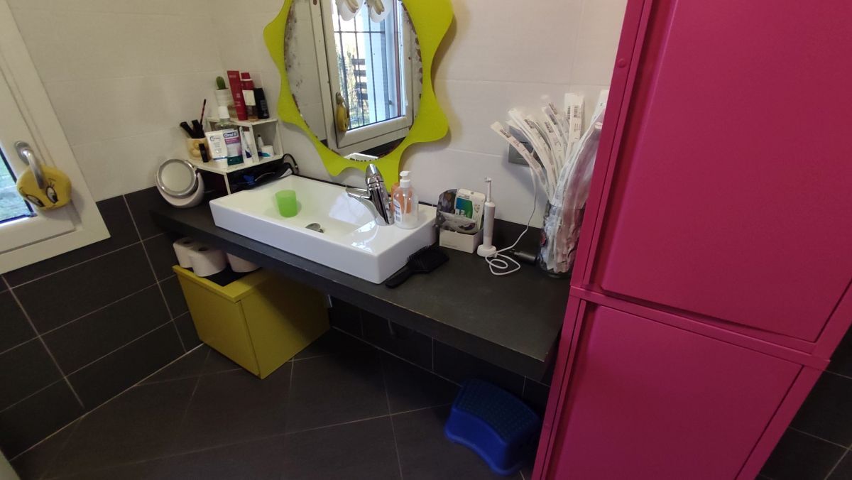 Questa zona del bagno è stata oggetto di una revisione completa, poiché è stato necessario integrare il volume della lavatrice, precedentemente assente. Se in un bagno tradizionale lo spazio contenitivo può essere facilmente ricavato attraverso colonne o pensili collocati sopra il mobile lavabo, in questo caso non vi era né lo spazio sufficiente per inserire colonne, né – per evidenti ragioni legate all’accessibilità e alla libertà di movimento – la possibilità di prevedere pensili sospesi standard.