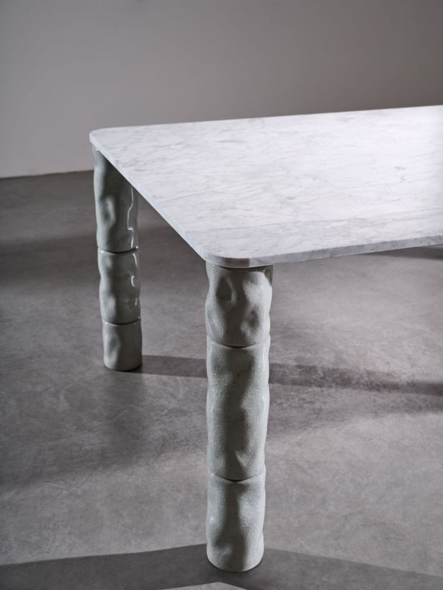 Tavolo Brick (design Paola Navone) di Gervasoni, con piano di marmo di Carrara levigato e gambe composte da cilindri torniti a mano di porcellana bianca e sabbia vulcanica.