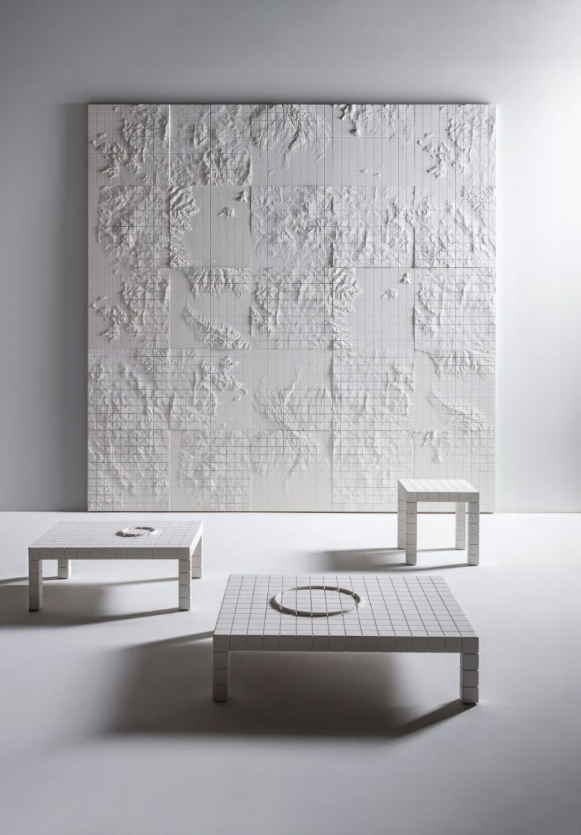 Rivestimento Geografia (design Martinelli Venezia) di Lithea, di marmo scolpito tridimensionalmente con rilievi terrestri e sottomarini