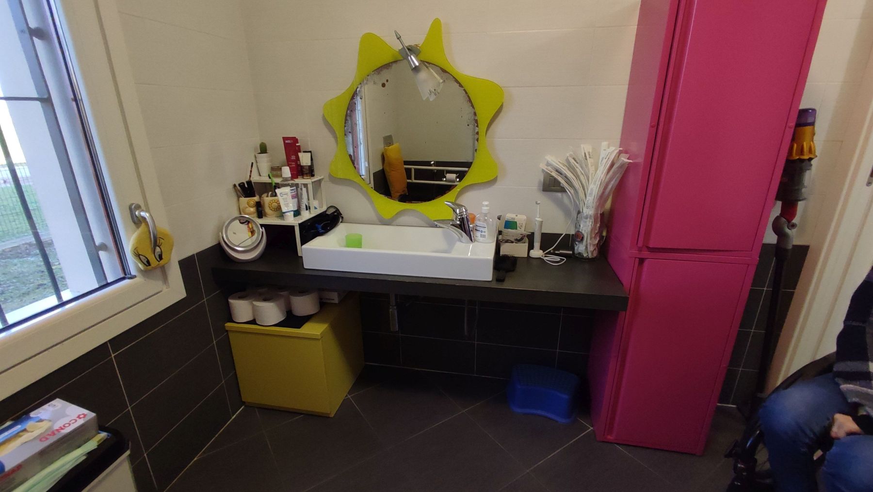 Per garantire un utilizzo agevole da parte di tutti, è stata installata una colonna doccia a due vie, con un doccino posizionato più in basso per Marcella e un soffione regolabile in altezza per eventuali ospiti. È stato inoltre progettato un mobile contenitivo con lavatrice rialzata, pensato per facilitare il carico e lo scarico del bucato, oltre a un lavabo di design installato su misura, completato da uno specchio a tutta parete per offrire una piena visibilità anche da seduti.