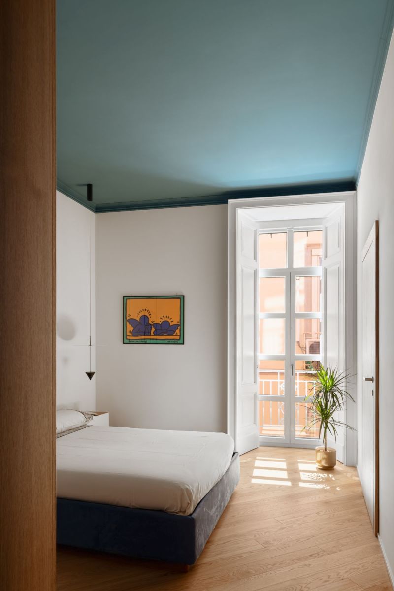 Nella zona notte, accessibile attraverso portali realizzati in coerenza con le essenze della cucina, le due camere con bagno en suite esprimono un linguaggio progettuale intimo, curato nei dettagli e attento alla funzionalità. Soffitti colorati, arredi integrati e soluzioni su disegno restituiscono l’idea di uno spazio accogliente e ordinato, modellato attorno alle esigenze e ai desideri dei proprietari.