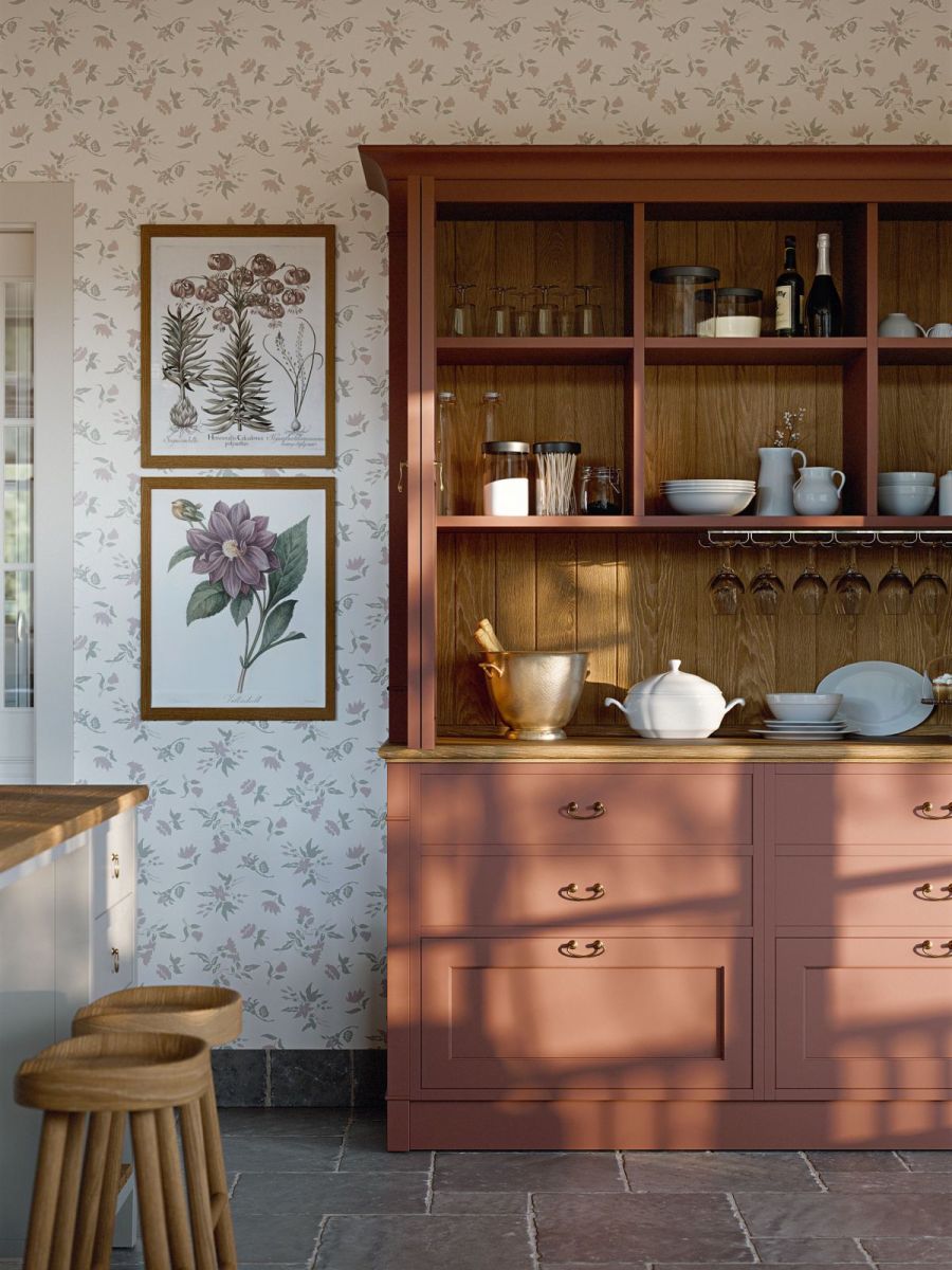 Le ante a telaio, le vetrine superiori e i dettagli classici richiamano il fascino delle cucine di campagna dal gusto inglese, mentre le finiture ricercate e i materiali naturali contribuiscono a definire un’atmosfera autentica e ospitale. Il piano in pietra e gli elementi in legno rafforzano la componente materica del progetto, restituendo un’immagine di eleganza durevole.