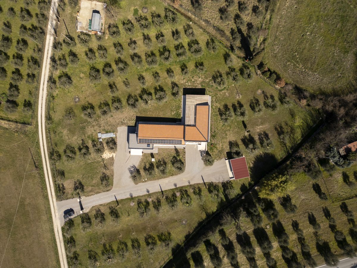 La residenza, con una superficie di 240 mq, si sviluppa su un unico livello fuori terra, con una pianta a “L” che orienta gli spazi principali verso il panorama mozzafiato della collina toscana. Le ampie vetrate, simbolo di un design essenziale e raffinato, permettono alla luce naturale di inondare gli interni, creando una costante connessione visiva con l’esterno. La posizione dell’edificio si integra perfettamente con il paesaggio, offrendo una vista privilegiata sugli uliveti e sul centro storico del paese.